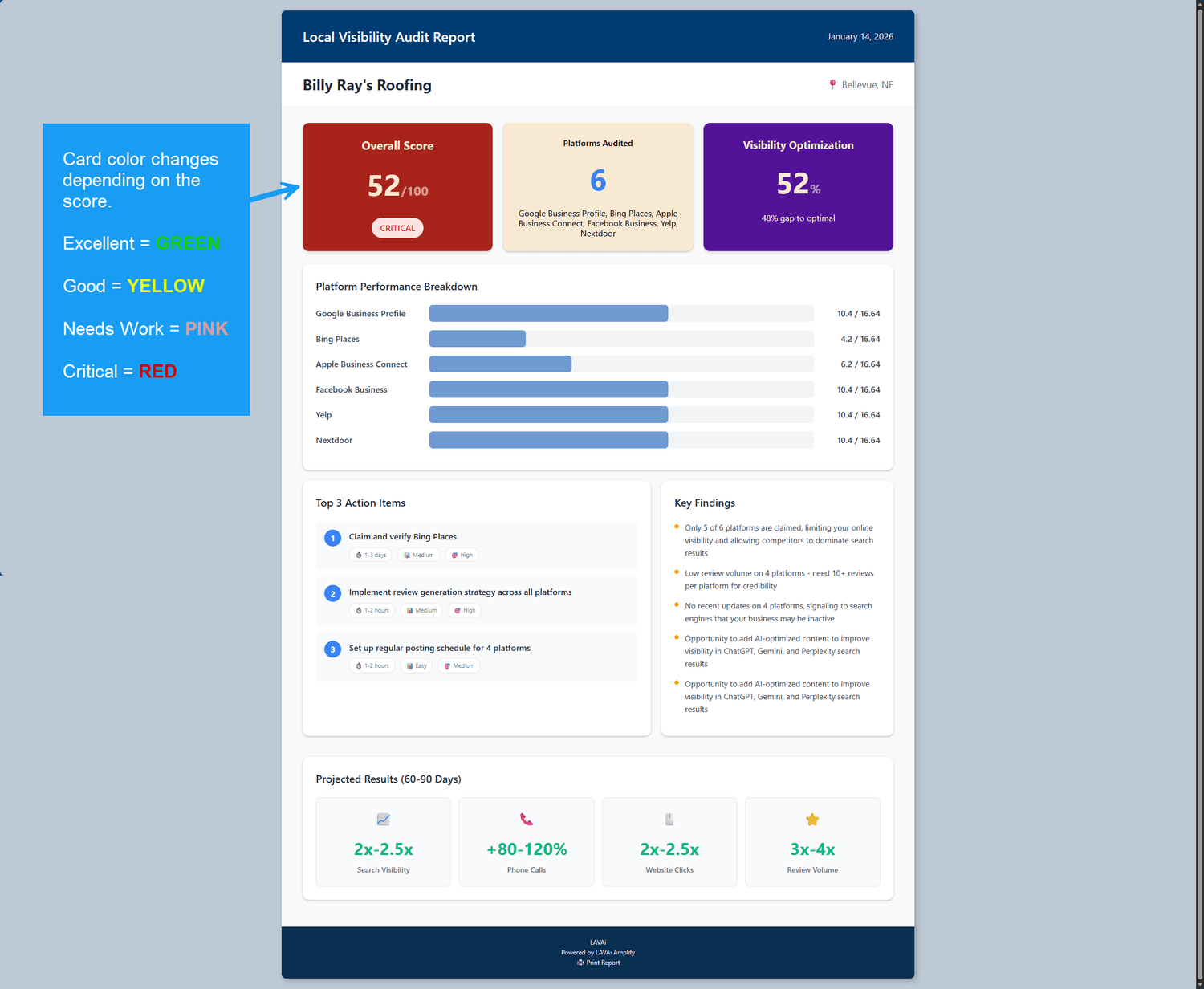 The "Aha!" Moment: You're sitting across from a local business owner. You open the LAVAi report on your tablet. You show them the color-coded visibility score. You walk them through the AI search section. Their eyes widen. "Wait, I don't show up at all when people ask ChatGPT?" You nod. "Not yet. But I can fix that." They lean forward. "Okay, how much is it to fix all this?" That's the moment everything changes.