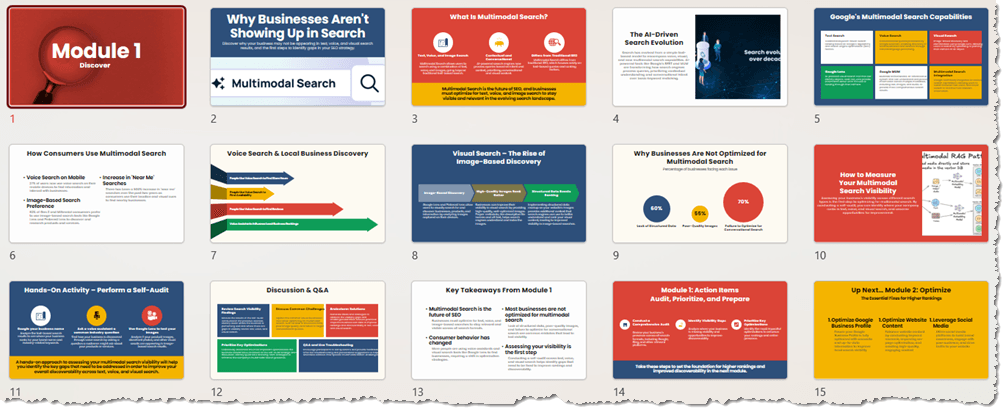 This 3-module Multimodal Search Mastery Workshop is fully built, tested, and ready to go.