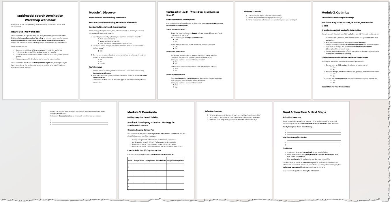 With the Multimodal Search Domination Workshop, you’re getting a hands-on, step-by-step system to help your clients rank higher and get found—no matter how people are searching.