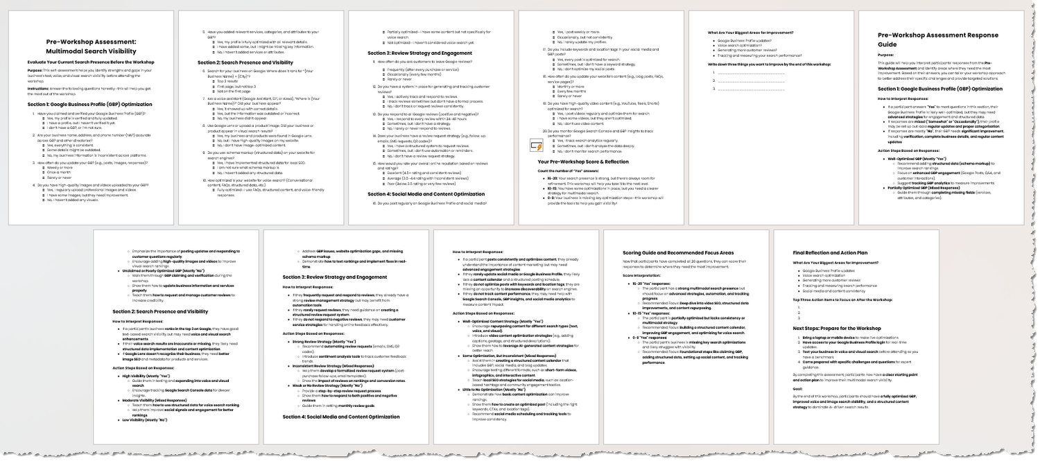 Many businesses assume they’re optimized for search, but the reality is that most are missing out on voice and visual discovery. This module walks participants through a hands-on visibility audit, helping them analyze their current search presence across Google, AI assistants, and image-based search tools. Real-world examples illustrate why traditional SEO alone is no longer enough, and how multimodal optimization ensures they appear wherever customers are searching.